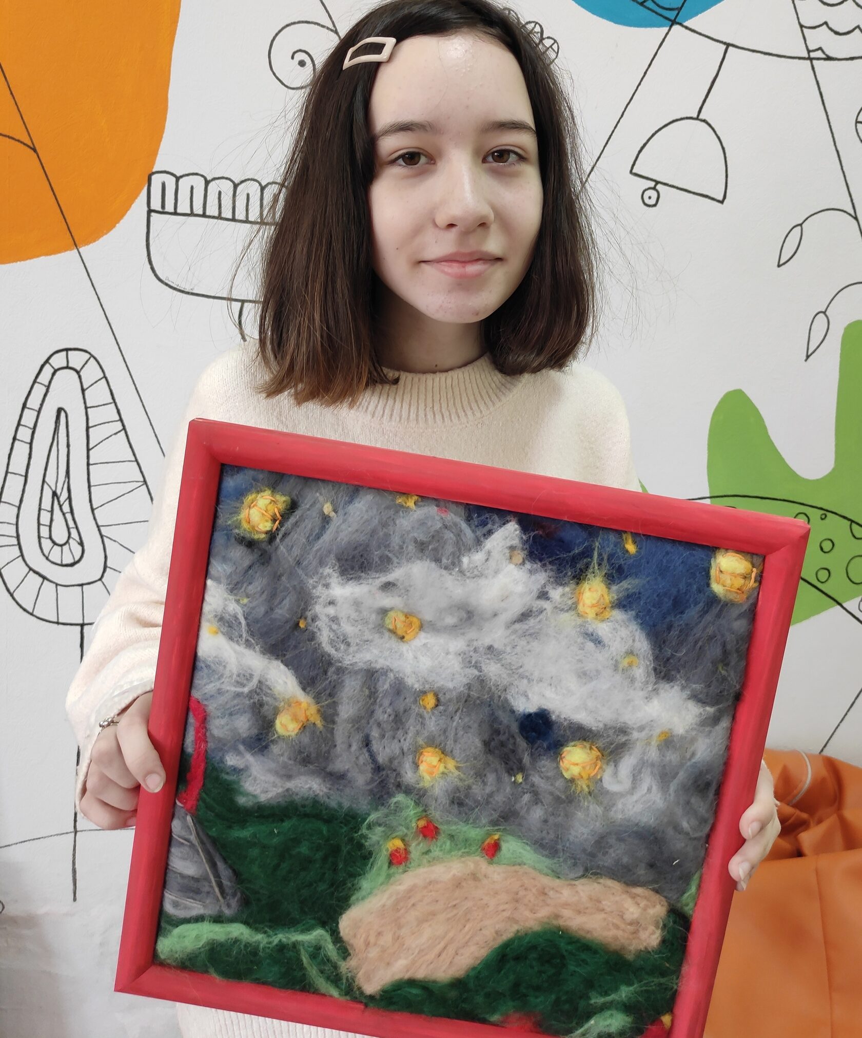2 курс был насыщен различными работами, например: много открыток, мягкая игрушка, маленькая ёлка, елочная игрушка, зеркало, рамку для фото и даже валяли из шерсти, создавая из неё картину!!